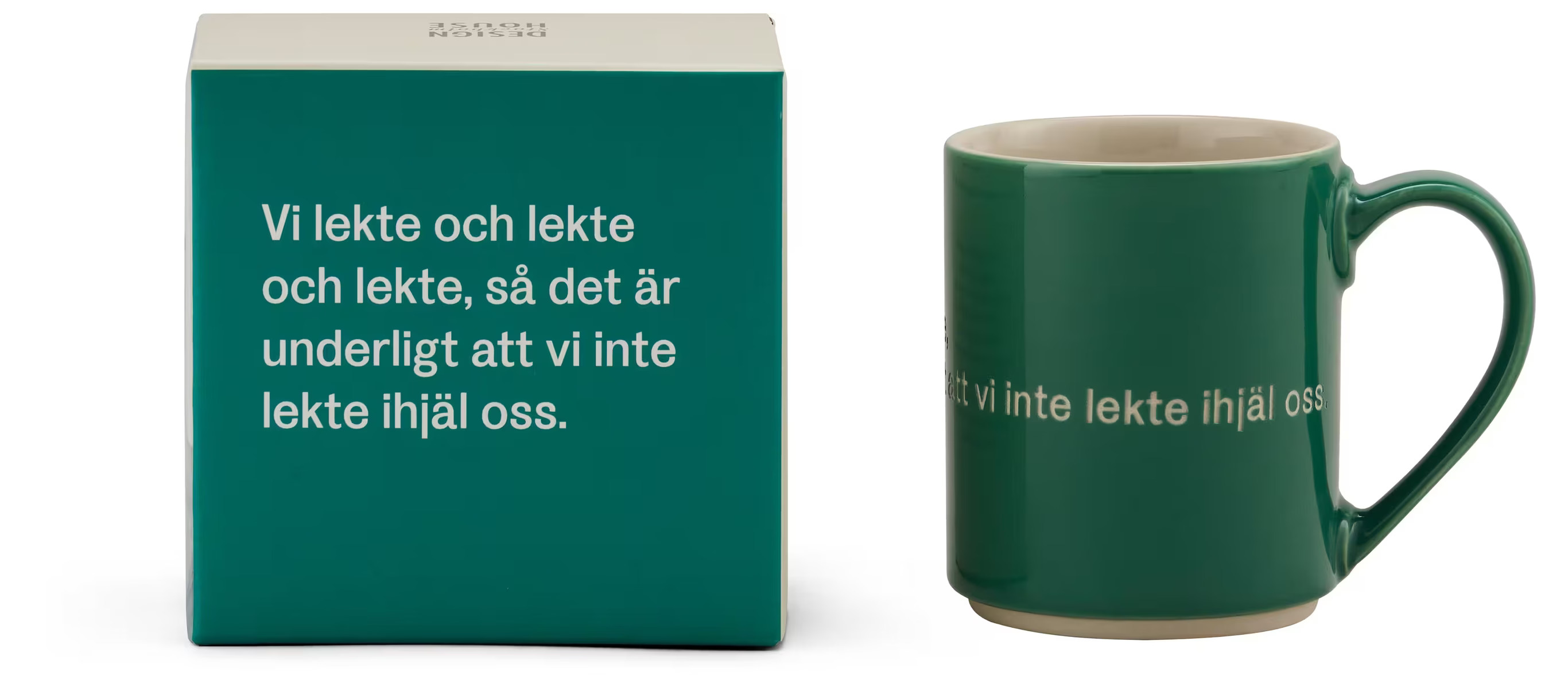 Bilden visar en produkt tillgänglig på Köpstaden.se, en mångsidig butik som erbjuder ett brett sortiment av produkter för vardagens alla behov. I fokus står en mugg från Design House Stockholm, en del av deras kollektion som hedrar Astrid Lindgrens älskade citat. Muggen har en djup, mörkgrön färg som ger ett stilrent intryck och gör att texten på muggen framträder tydligt.