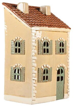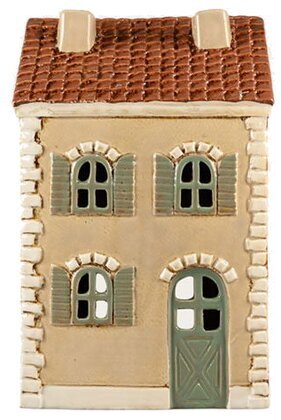 Skapa en varm och hemtrevlig känsla med denna vackra ljuslykta i form av ett hus. Den är tillverkad i keramik med fina detaljer – tegelliknande tak, gröna fönsterluckor och en klassisk dörr som ger den en tidlös charm.