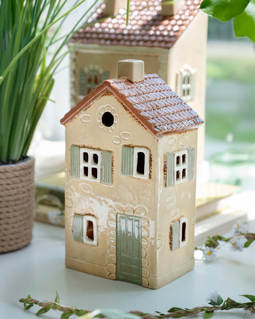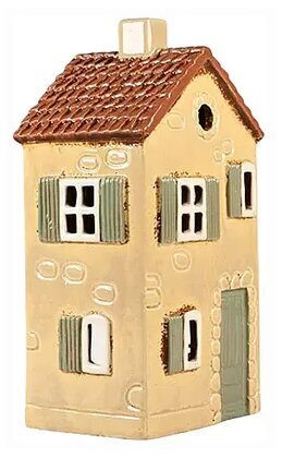 Ett charmigt keramikhus i mjukt beige med grön dörr och fönsterluckor som sprider en lantlig, hemtrevlig känsla. Ljuset från ett värmeljus eller en batteriljusslinga lyser vackert genom fönstren och ger en mysig atmosfär i rummet.