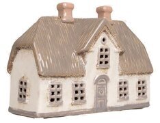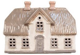 Ett vackert ljushus i keramik formad som en liten stuga med halmtaksstruktur i beigegrå ton och två skorstenar. När du tänder ett värmeljus sprider sig ett varmt, stämningsfullt ljus genom de små fönstren och skapar en hemtrevlig atmosfär.