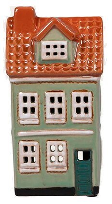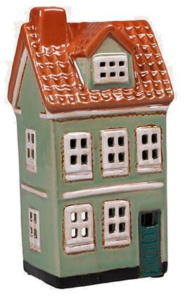 Ett charmigt ljushus i keramik med gröna väggar och ett varmt tegelfärgat tak som skapar en hemtrevlig känsla i rummet. När du tänder ett värmeljus sprider sig ett mjukt sken genom fönstren och får huset att lysa upp som en liten miniatyr av ett gammalt stadshus.