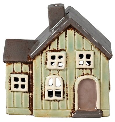 Detta charmiga lilla hus har en mjukt gröntonad fasad med klassiska paneldetaljer och ett grått tak som ger ett lugnt och hemtrevligt uttryck. De små fönstren och den rundade dörren skapar en varm och inbjudande känsla. Keramiken har en fin glaserad yta som gör huset dekorativt både med och utan ljus.