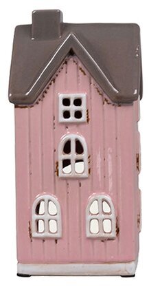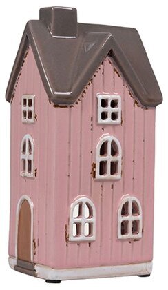 Detta rosafärgade hus har en charmig, hög och smal form som ger det ett unikt uttryck i en uppställning. Den mjuka rosa nyansen, de klassiska panelerna och det grå taket skapar en fin kombination som passar både som solitär och tillsammans med andra hus. De rundade fönstren och den glaserade ytan gör huset dekorativt även när det inte lyser.