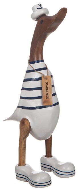Ankans näbb och hals är naturligt färgade och visar upp bambuns ursprungliga trätoner, vilket skapar en fin kontrast mot den övriga dräkten. Detta ger figuren en naturlig och jordnära känsla, samtidigt som den passar in i hem med en nautiskt inspirerad inredning. På huvudet bär ankan en liten sjömanshatt, även den vit med en marinblå rand, vilket förstärker den marina känslan ytterligare.