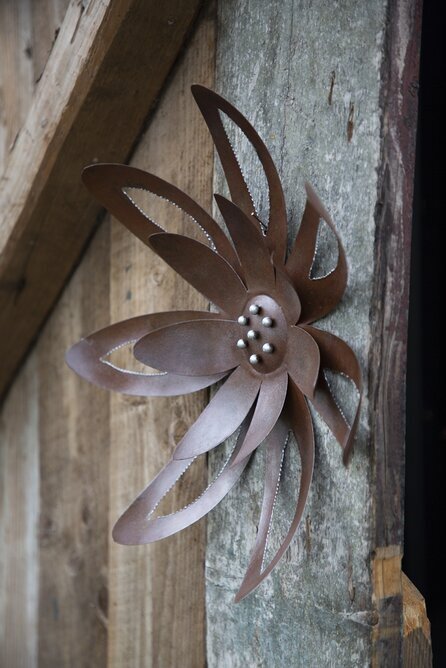 Bakgrunden, en vägg av rått, grovt trä, förstärker dekorationens estetik genom att tillföra en organisk känsla som smälter väl ihop med metallblommans egen design. Det grova träet har synliga ådringar och en naturlig patina som åldrats med värdighet. Tillsammans med den hamrade plåten framställs en symbios mellan det industriella och det naturliga, en harmonisk balans som är både iögonfallande och subtil.