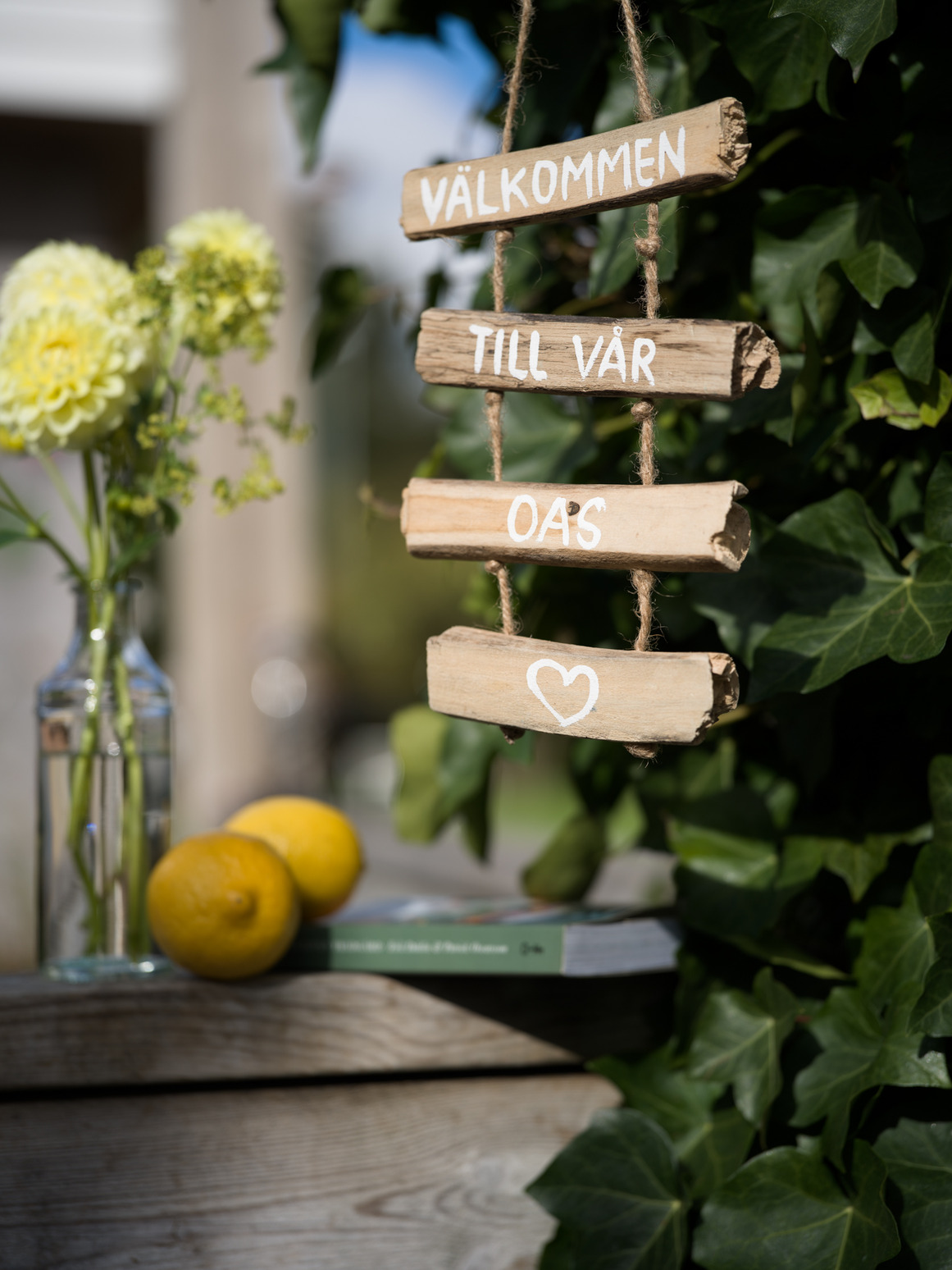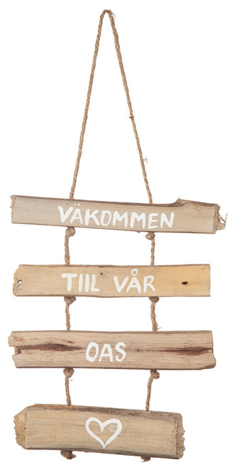 Hängande mobil tillverkad av drivved - Välkommen till vårt smultronställe. Läs mer