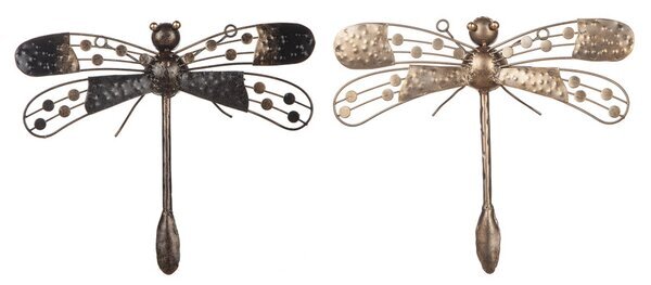 Till vänster ser vi en trollslända med mörka, distinkta vingar. Vingarna, som succesivt övergår från en svart till en ljus nyans längs spetsarna, har en prickad och perforerad design som tillför ett djup och en intressant skuggeffekt mot väggen. Kroppen är slank och skulpterad med en detaljerad yta som framhäver de hamrade elementen. Huvudet är rundat med små, distinkta ögon som står i proportion till resten av kroppen.