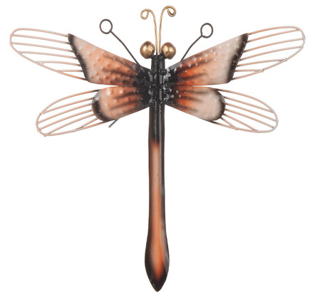 Denna bild visar en dekorativ väggskulptur som föreställer en trollslända, tillverkad av hamrad plåt. Produkten, som är tillgänglig hos Köpstaden.se, tillhör varumärket Different Design. Trollsländan är noggrant utformad med ett uppmärksamt sinne för detaljer, vilket visar sig i den komplexa strukturen hos dess vingar och kropp.