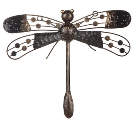 Trollsländan har en robust och metallisk konstruktion med detaljerad utformning. Vingarna är utspridda och komplext byggda med flera sektioner. Den yttre kanten av vingarna har en cirkelformad design med flera små, runda metallstycken inplacerade, vilket ger ett dynamiskt och intressant mönster. Vingarna har en mörk ton där färgen skiftar från djup svart till bränd koppar, vilket ger en unik patina och textur.