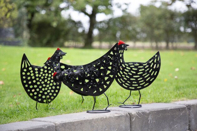 Bilden från Köpstaden.se visar en trio av dekorativa höns, tillverkade i svart hamrad plåt av märket Different Design. Dessa skulpturer placerar sig på en låg stenkant, omgiven av frodigt grönt gräs vilket ger en livfull kontrast mot den mörka metallen. Varje tupp och höna har sin egen unika detaljer som fångar blicken direkt.