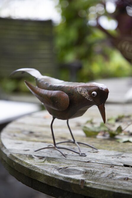 Bakgrunden i bilden utgörs av en trädgårdsmiljö där bordet i trä, på vilket fågeln står, har en naturligt sliten och väderbiten look. Detta förstärker intrycket av att fågeln är en del av utemiljön, kanske placerad för att ge liv åt en trädgårdsdekoration eller en uteplats. De diffusa gröna tonerna i bakgrunden tyder på växtlighet och skapar en harmonisk miljö som kompletterar fågeln i metall.