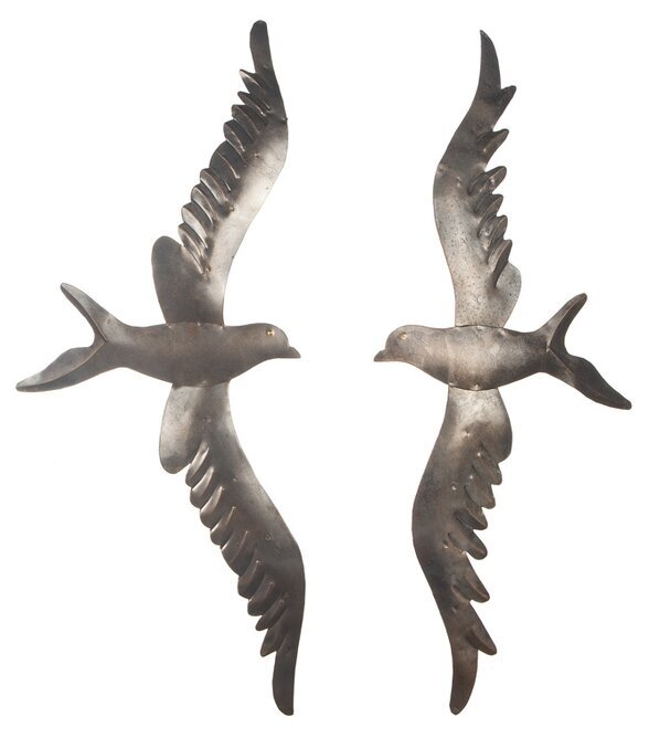 Bilden visar två dekorativa väggprydnader i form av fåglar, skapade av varumärket Different Design och finns tillgängliga hos Köpstaden.se. Dessa fågelprydnader är tillverkade i plåt och utstrålar en rustik känsla genom sin metalliska yta. Båda fåglarna är avbildade i flykten, med eleganta och detaljerade vingformer som skapar en känsla av rörelse och liv.