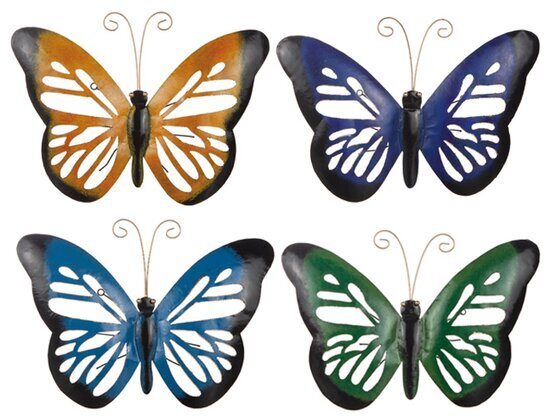 På bilden ser vi fyra konstnärligt utformade fjärilar, representerade i olika färger, som är skapade av Different Design. Dessa fjärilar är gjorda av hamrad plåt och mäter 30x40 cm. Var och en av fjärilarna har en unik färgpalett som ger dem ett distinkt utseende, vilket kan passa i olika interiörer.