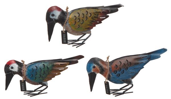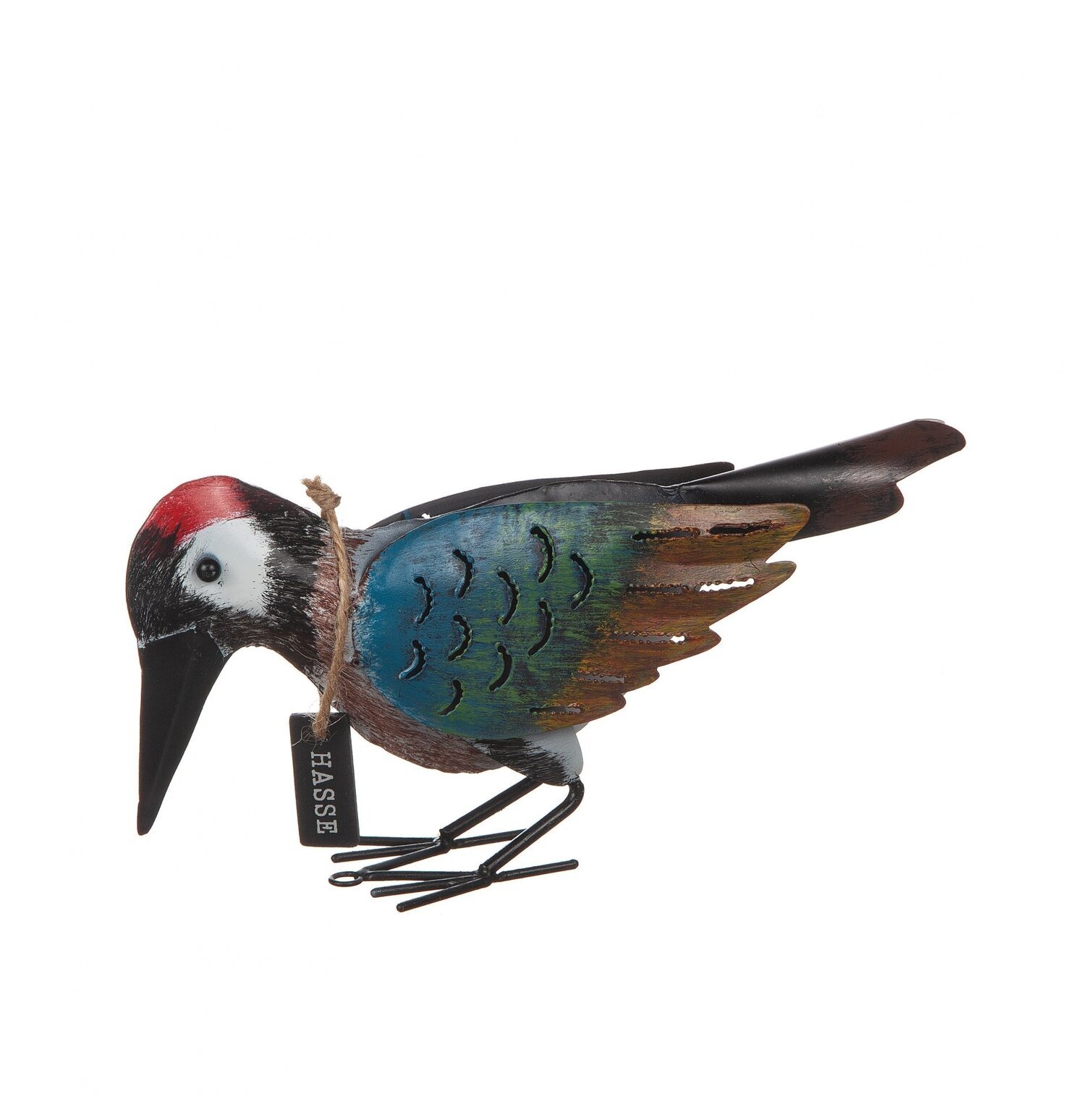 Dekorativ hackspett i hamrad plåt, varje fågel är handmålad så det kan förekomma variationer i utsende.