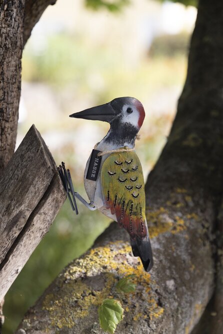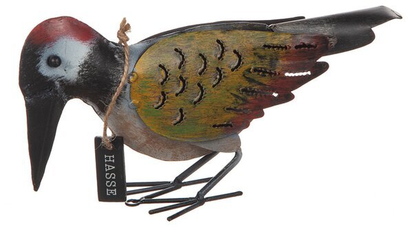 Dekorativ hackspett i hamrad plåt, varje fågel är handmålad så det kan förekomma variationer i utsende. Läs mer