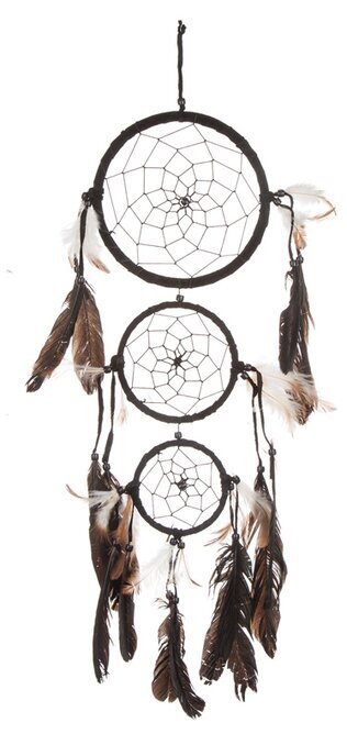 Bilden visar en elegant drömfångare från Köpstaden.se, en butik som erbjuder en mångfald av produkter för olika vardagsbehov. Denna specifika drömfångare, känd som Drömfångare Trippel Svart, kommer från varumärket Different Design. På bilden framträder tre sammankopplade ringar, var och en med ett intrikat nät av trådar som bildar ett spindelvävsliknande mönster. Den största ringen är placerad överst och ger ett kraftfullt intryck.