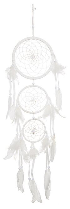 Bilden från Köpstaden.se visar produkten Drömfångare Trippel Vit från varumärket Different Design. Denna drömfångare har en imponerande och detaljerad design som fångar ögat. Den består av tre cirkulära delar, avtagande i storlek, som är placerade vertikalt under varandra. Varje cirkel är omsorgsfullt vävd med ett nät i mitten, det typiska kännetecknet för en drömfångare.