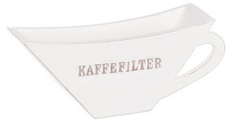 Hållaren är formad som en stilren, vit kopp med en modern och minimalistisk design. Den är konstruerad i en robust stil som samtidigt är enkel och funktionell. Bokstäverna "KAFFEFILTER" pryder framsidan i tydliga versaler, vilket ger en karaktäristisk touch och underlättar identifieringen av dess användning.