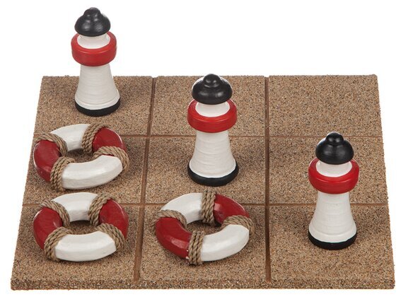 Tre i rad på en brun sandplatta med spelpjäser av fyrar & bojar. Från Different Design.