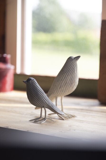 Bakgrunden visar ett suddigt grönt landskap utanför fönstret, vilket kan antyda att bilden är tagen i ett lantligt eller naturligt miljö. Ljuset som strömmar in genom fönstret kastar mjuka skuggor över fågelstatyetterna, vilket ytterligare framhäver deras form och funktion som en dekorativ detalj. En röd burk eller kruka är delvis synlig på avstånd till vänster, vilket tillför en färgklick till den annars neutrala färgpaletten i bilden.