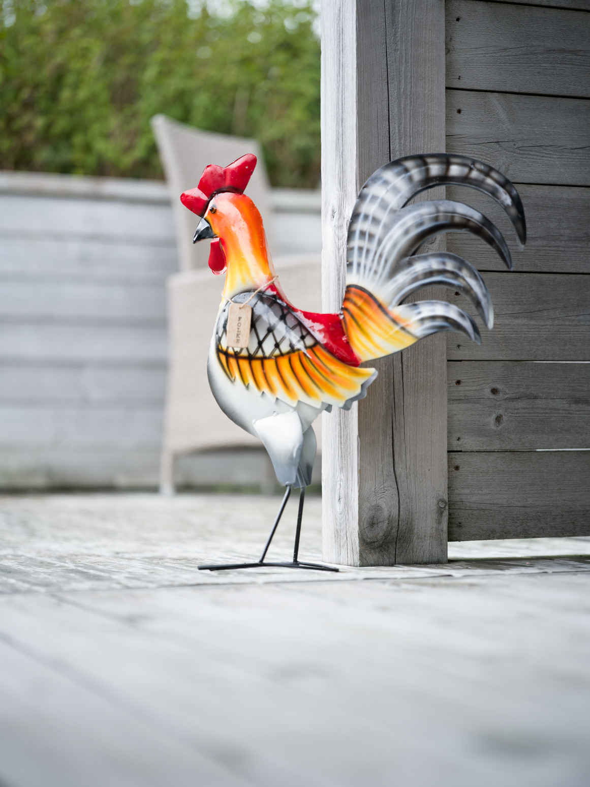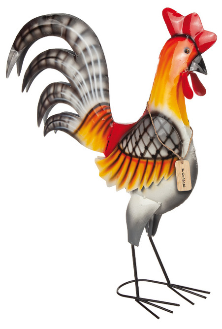 En färgstark tupp i metall som blir ett härligt blickfång i trädgården, på altanen eller vid entrén. Med sin imponerande stjärt, livfulla färger och dekorativa detaljer ger den en lekfull och lantlig känsla till utemiljön.