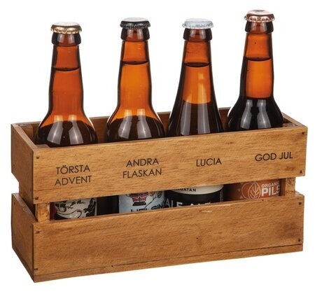 Lådan är utformad för att rymma fyra flaskor, och varje flaska är tydligt avskild med hjälp av träsektioner. På framsidan av lådan kan man se inristade texter som läser "Törsta advent", "Andra flaskan", "Lucia" och "God jul", vilket antyder dess användning i samband med julfirandet. Dessa graverade ord ger en personlig touch och förstärker lådans tema för advent- och julperioden.