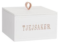 På framsidan av trälådan är texten "TJEJSAKER" tydligt målad i en något djärv och rustik stil, vilket gör det enkelt att identifiera lådans avsedda användningsområde. Bokstäverna verkar ha en lätt antik finish, vilket förstärker en känsla av handgjord charm. Denna design gör lådan både praktisk och tilltalande som en del av inredningen.