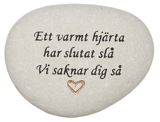 Vit sten med graverad text - Ett varmt hjärta har slutat slå, Vi saknar dig så. Från Different Design. Läs mer
