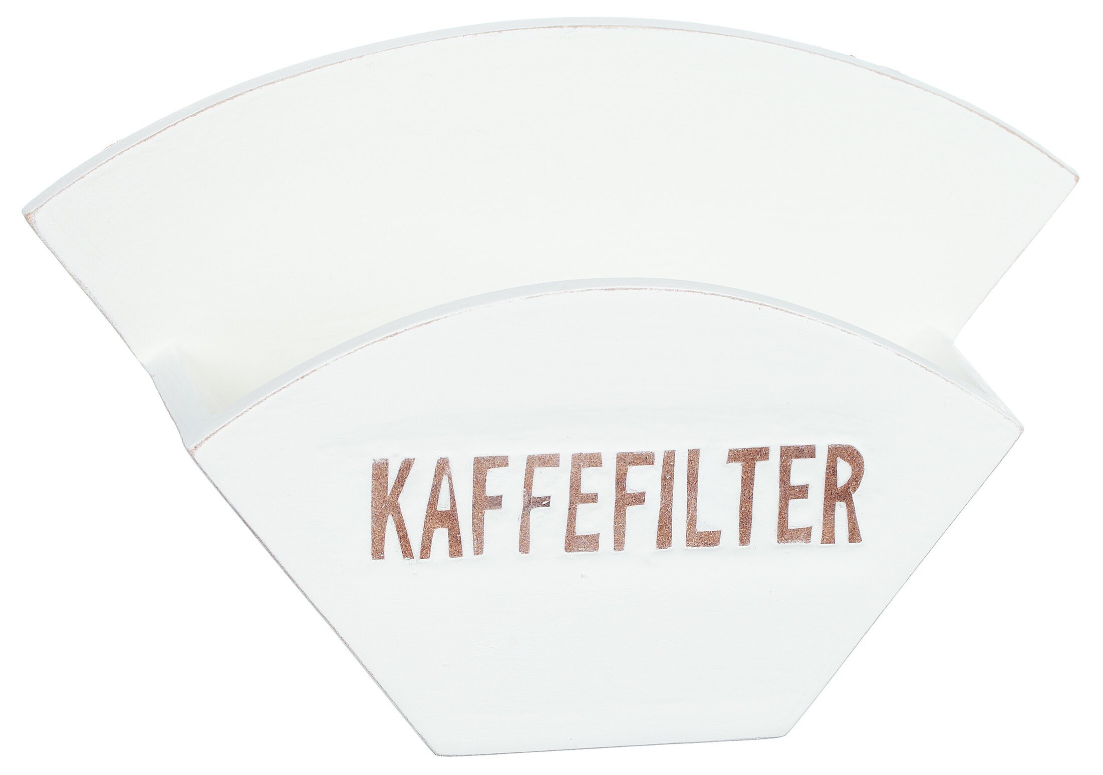 På framsidan av hållaren finns ordet "KAFFEFILTER" tryckt med stora, lättlästa bokstäver. Texten är i en mörkare nyans, vilket skapar en tydlig kontrast mot det ljusare materialet och ökar läsbarheten, även på avstånd. Denna detaljerade text ger ett funktionellt syfte, genom att enkelt visa vad som förvaras inuti, men fungerar också som en dekorativ element.