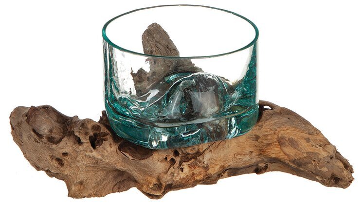 Dekorativ glasskål som formats efter dess medföljande trädrot, drivved som plockas upp från stranden & som tillsammans blir ett vackert återbruk. Kan användas både som skål, vas eller kruka till höstens & vinterns planteringar.