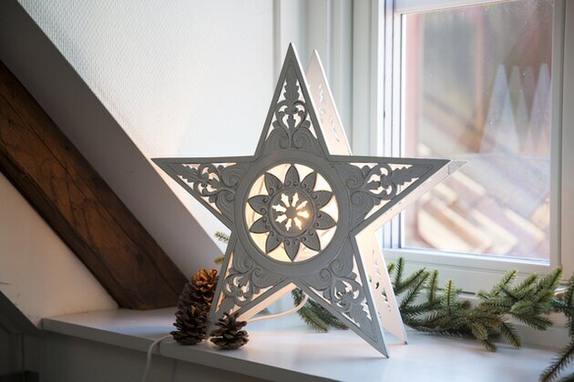 På bilden syns en dekorativ lampa i form av en stjärna, placerad på en fönsterbräda. Produkten heter Lampa Stjärna Trä och kommer från varumärket Different Design, tillgänglig hos butiken Köpstaden.se. Stjärnlampan är tillverkad av trä och visar upp ett noggrant utskuret mönster. Dessa detaljerade utskärningar skapar ett intrikat och symmetriskt mönster som i kombination med ljuset inuti gör att stjärnan verkligen framträder i rummet.