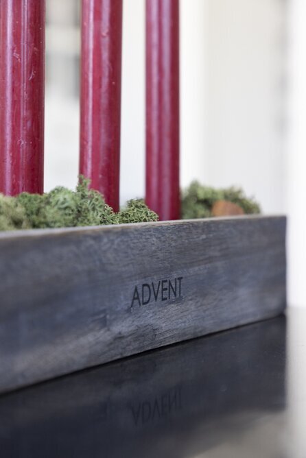 Ljusstaken är designad som en avlång rektangulär bas, tillverkad i ett grått material som påminner om åldrat trä, vilket ger den en tidlös och klassisk känsla. Träets textur är synligt mjuk och jämn, något som harmoniserar väl med de intryckta bokstäverna som stavar "ADVENT" på basens framsida. Denna subtila inskrift ger en diskret påminnelse om produktens syfte och användning inför julens efterlängtade ankomst.