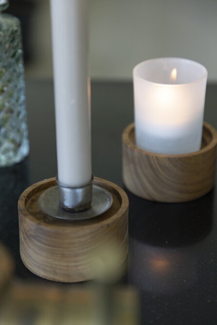 Ljuslykta i teak med plats för kronljus. Från Different Design.