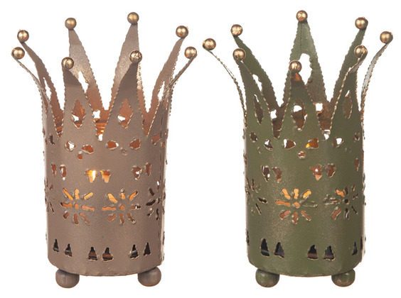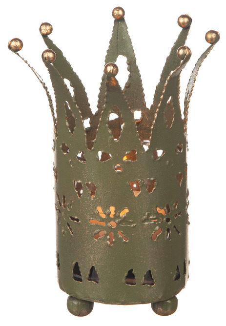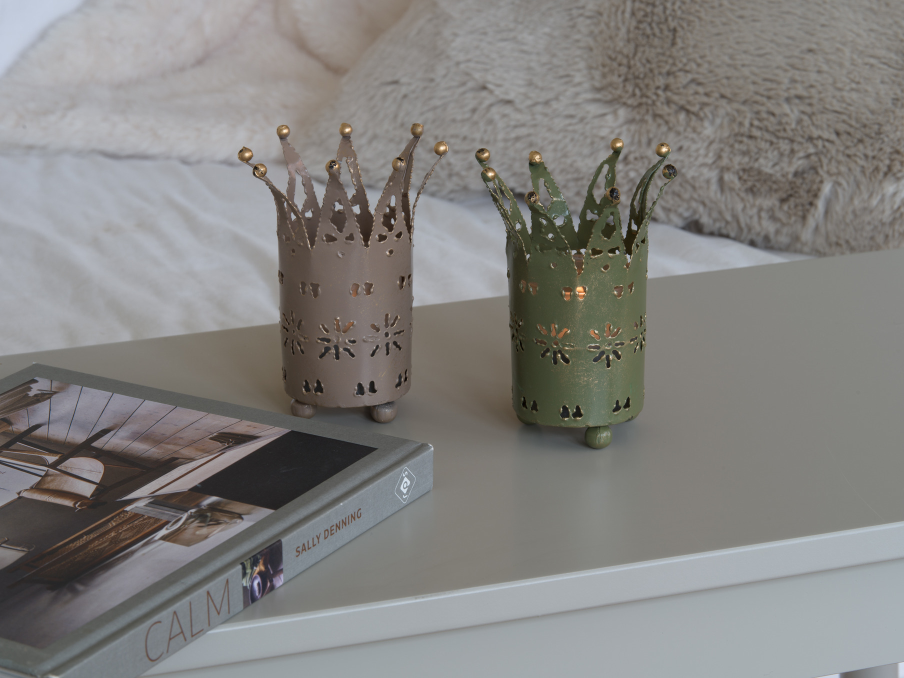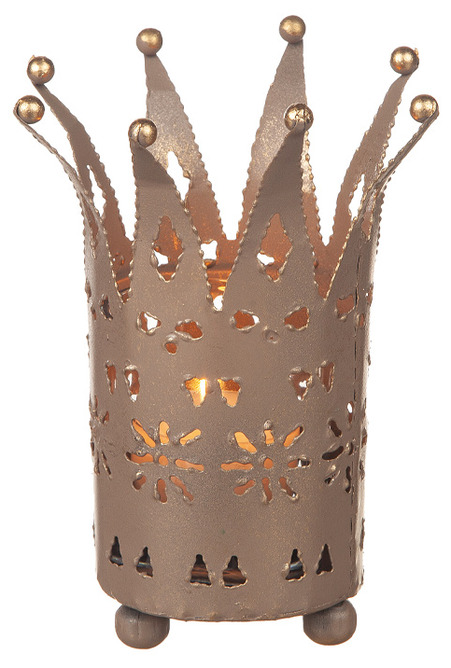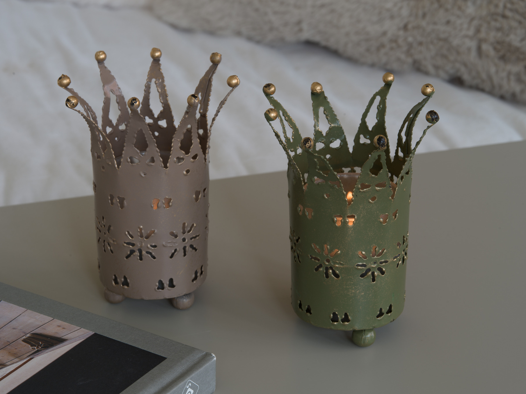 En vacker och stämningsfull ljuslykta formad som en krona, tillverkad i hamrad plåt med handmålade detaljer. De utskurna mönstren släpper igenom ett mjukt och levande sken som skapar en varm atmosfär i rummet. Ljuslyktan står stadigt på små fötter och blir en dekorativ detalj både ensam och i grupp.