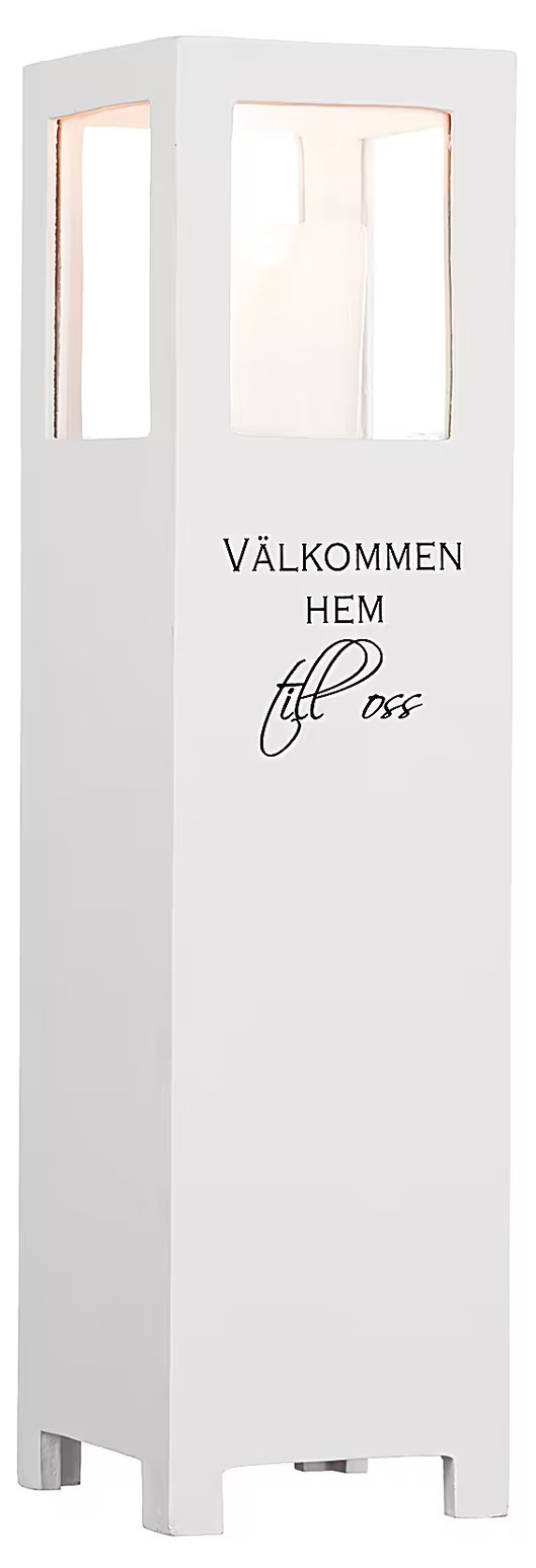 Framsidan av ljuslyktan pryds med texten "Välkommen Hem till oss", vilket ger en inbjudande känsla. Texten är tryckt i olika typsnitt för att ge en visuell kontrast och ett personligt intryck. Den översta delen av lyktan har fyra glasfönster, vilket gör att ljusets sken kan spridas jämnt och ge ett behagligt ljusflöde omkring sig.