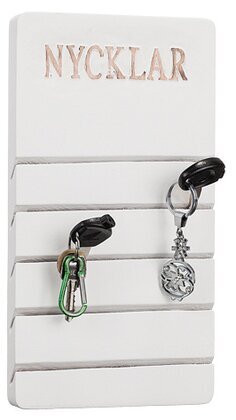 Den rektangulära formen ger en tydlig struktur, och ytan är målad i en mjuk vit ton. På ovansidan av hängaren är ordet "NYCKLAR" inristat i sirliga bokstäver, vilket ger en tydlig indikation av produktens funktion. Det finns fyra horisontella skåror där olika nyckelknippor kan placeras, vilket skapar en praktisk och organiserad lösning för nyckelförvaring.