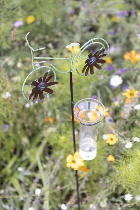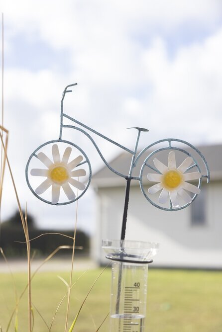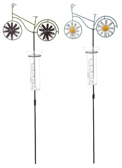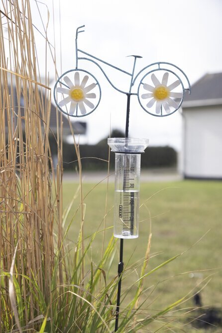 Regnmätare föreställandes en cykel med hjul som snurrar när det blåser, en dekorativ detalj i trädgården. Regnmätaren är delbar & har en total längd på ca 130 cm. Mätarglas i plast medföljer. Från Different design. Regnmätaren är delbar vid förvaring.