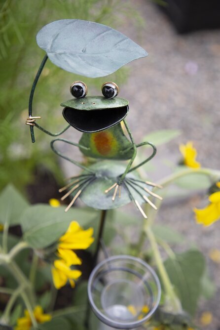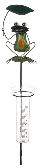 Regnmätare föreställande en groda med ett blad som paraply, en dekorativ detalj i trädgården. Från Different design. Läs mer