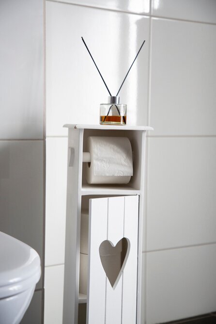 Träskåpet är designat för att förvara toalettrullar på ett snyggt och praktiskt sätt. I det öppna facket under toppen finns en rulle till hands för enkel åtkomst. Den nedre delen av det smala skåpet har en praktisk liten dörr med den hjärtformade utskärningen, som tillför både estetik och funktionalitet. Förutom att fungera som handtag för lättare öppning, gör designen det möjligt att kika in i skåpets innehåll.