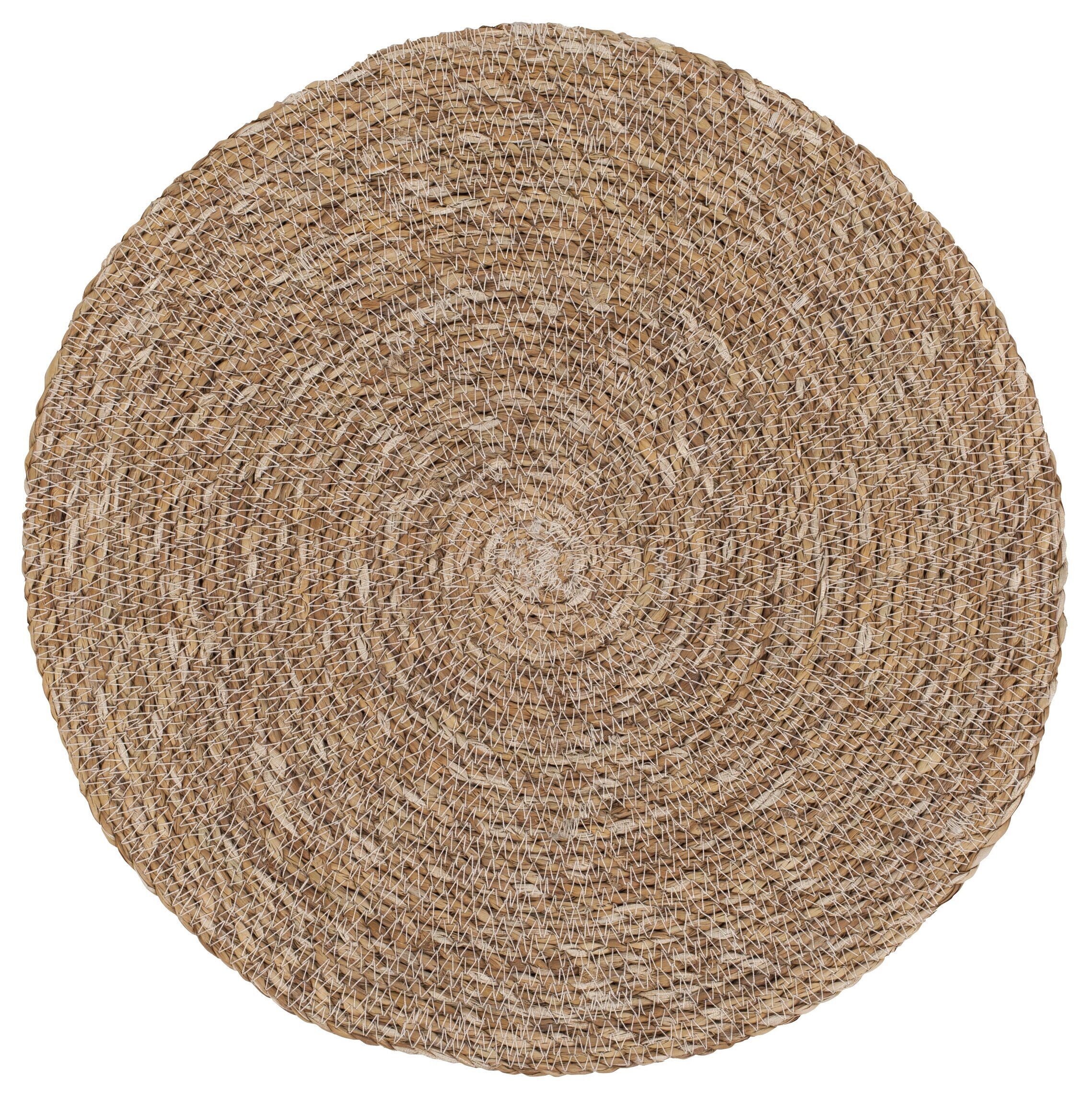 I detalj kan man se att fibrerna är tätt sammanflätade i ett cirkulärt mönster, vilket inte bara förstärker tablettens hållbarhet utan även ger den textur och djup. Mönstret har en spiralformad design som leder blicken från tabletens centrum utåt, vilket ger en känsla av naturlig rörelse. Dessa egenskaper gör produkten till ett utmärkt val för den som söker en jordnära och stilren dukning.
