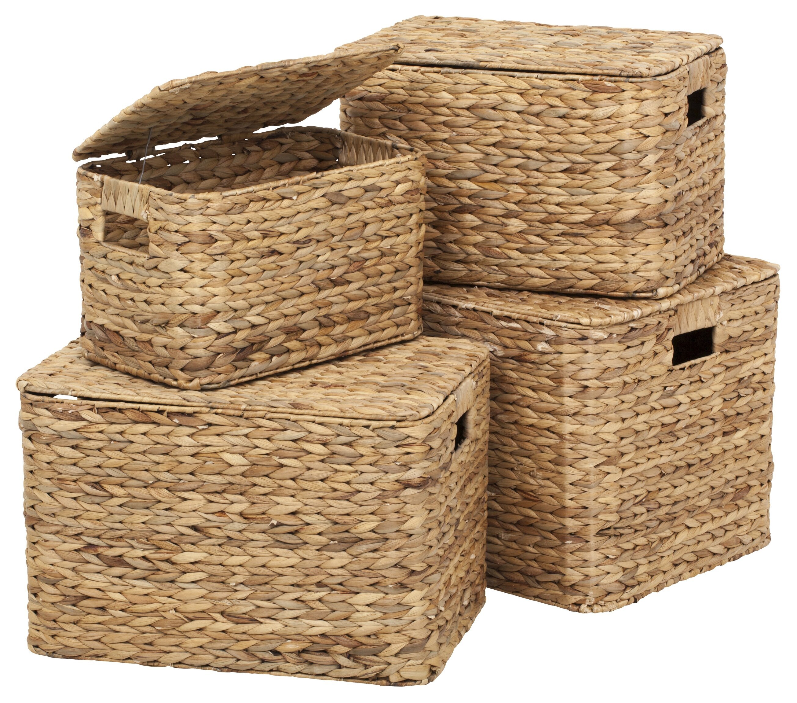 Varje korg har en rektangulär form med en praktisk design. Två av korgarna är placerade bredvid varandra med locken stängda, medan en korg visar locket uppfällt, vilket ger en tydlig insikt i hur de ser ut inuti. De flätade fiberstrukturerna ger inte bara styrka utan också en intressant yttextur som fångar ljuset på ett tilltalande sätt. Locken är tillverkade av samma flätade material och är designade för att passa perfekt ovanpå korgarna, vilket bidrar till en enhetlig och stilren uppbyggnad.