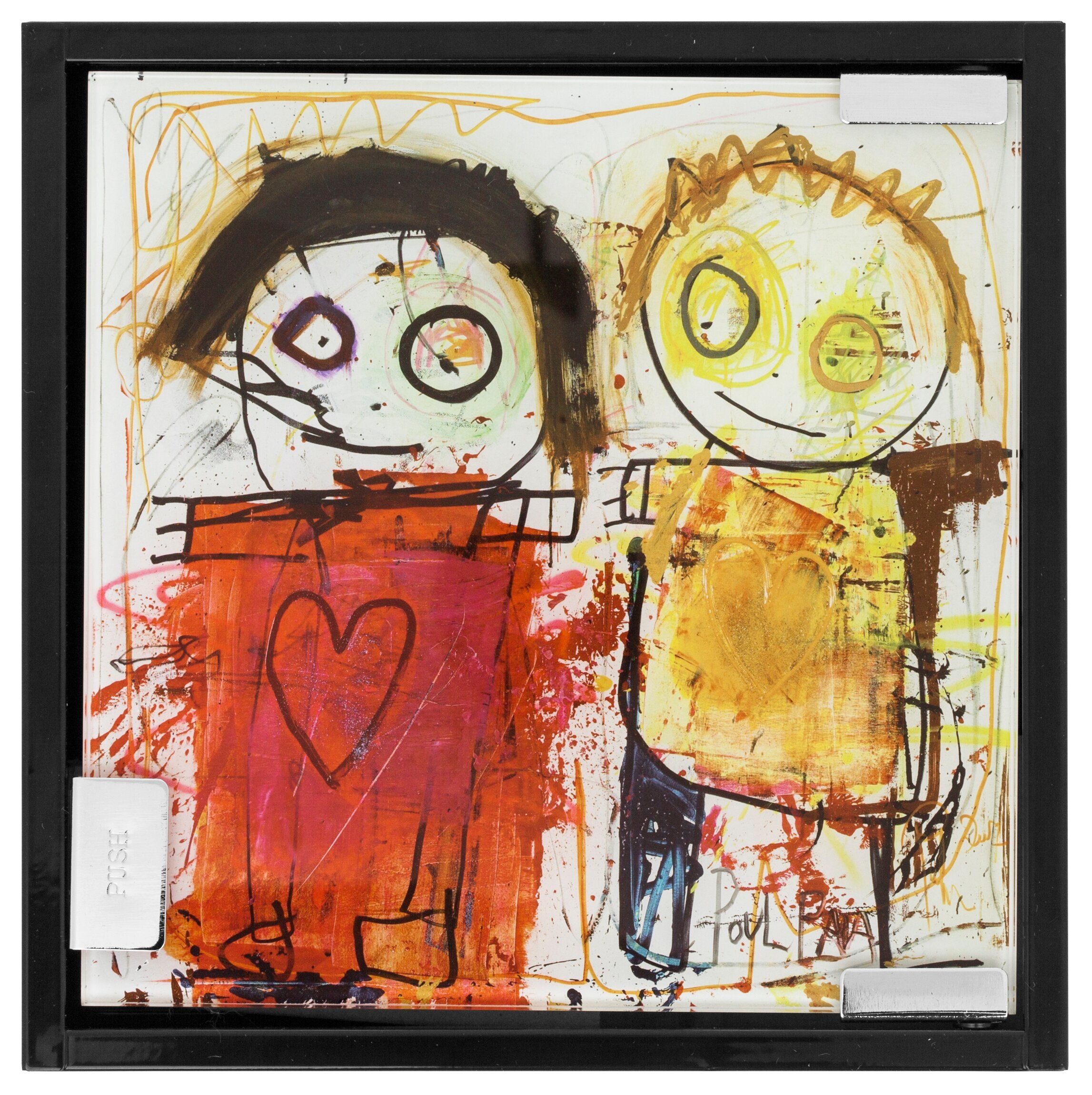 Bakgrunden är en explosion av färger, där olika nyanser av gult, rött, och brunt smälter samman för att bilda en dynamisk och energisk komposition. Streck, former och färgstänk över hela ytan ger en känsla av spontanitet och kreativitet. Ramen runt verket är svart och diskret, vilket fokuserar blicken på de centrala figurerna och förstärker kontrasterna.