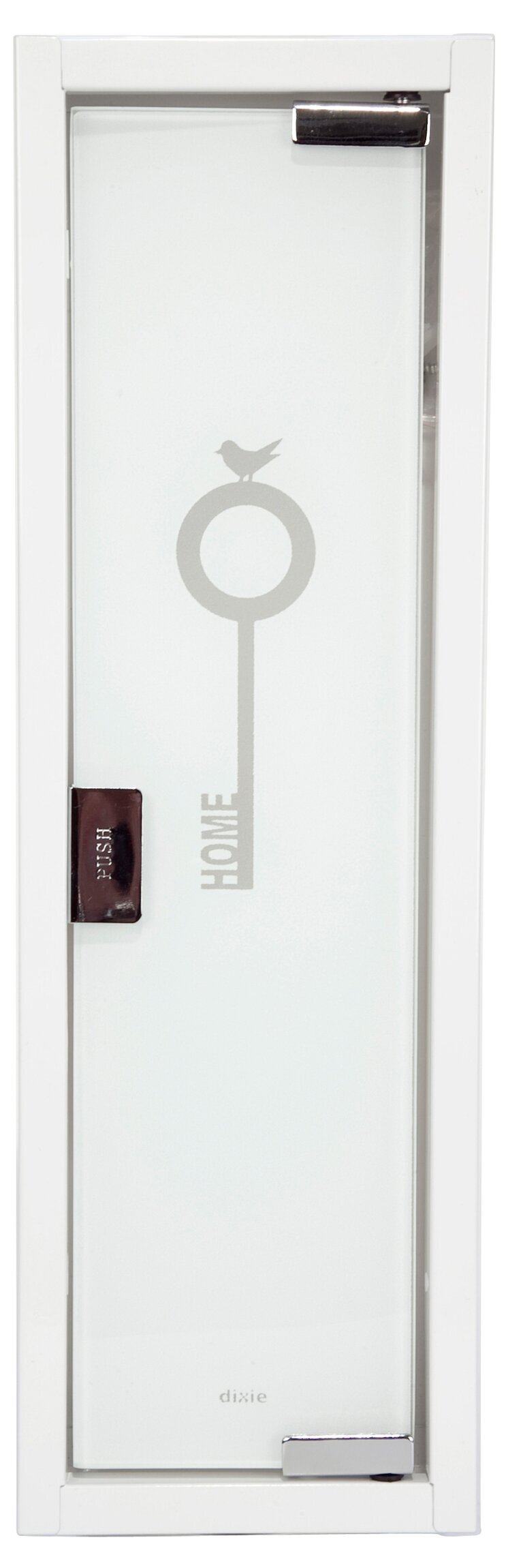 Framsidan av skåpet pryds av en frostad glasdörr, vilket dämpar insynen och ger en viss integritet utan att vara helt ogenomskinlig. På glaset finns en subtil tryckt illustration - en stiliserad nyckel där en liten fågel stoltserar ovanpå. Under denna dekorativa detalj står ordet "HOME", vilket tillför en hemtrevlig känsla och understryker syftet med skåpet. Motivet är diskret men ändå tillräckligt framträdande för att ge karaktär till skåpets utsida.