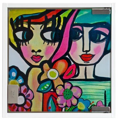 Nyckelskåpets frontmotiv visar två stiliserade ansikten, där konstnärliga penseldrag ger både liv och uttryck. Ansiktena har stora, uttrycksfulla ögon och markerade läppar i intensiva färger, vilket tillför en viss dramatik. De många färgerna som användes i designen, från djupa havsblå nyanser till varma rosa toner, skapar en harmonisk men ändå livfull bild. I förgrunden ser vi färgglada blommor, som ytterligare förstärker det konstnärliga intrycket.