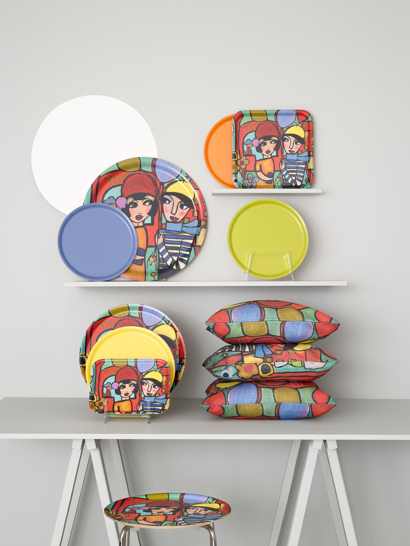På den övre hyllan ser vi, från vänster till höger, en rund bricka i lavendelblå ton, följt av en mindre rund bricka i limegrönt och en fyrkantig bricka där det konstnärliga motivet återigen framträder. En bred, orangefärgad bricka står delvis överlappad mot den fyrkantiga, vilket tillför dimension och djup till presentationen.