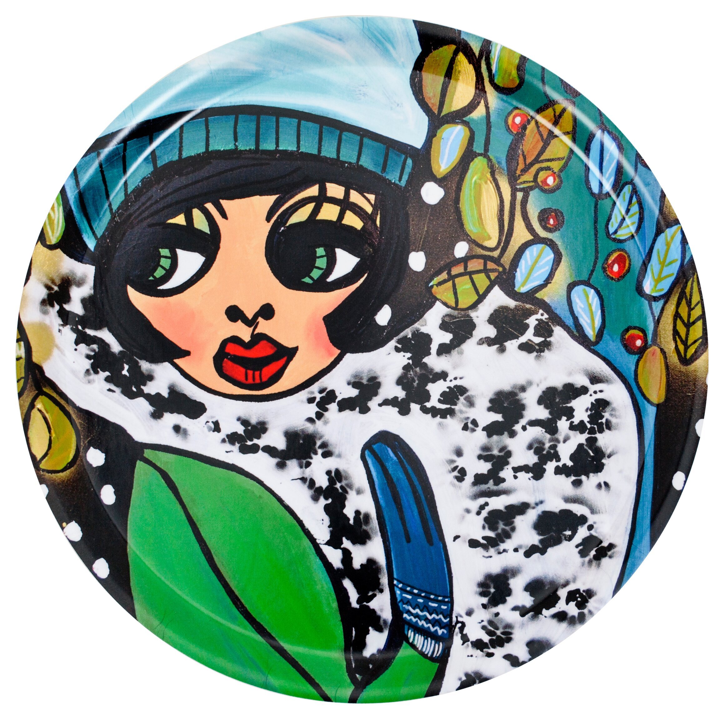 På bilden syns en dekorativ bricka från Köpstaden.se, specifikt produkten "Bricka Vinterfin" från det välkända varumärket Dixie. Denna bricka, rund till formen, bjuder på en färgrik och konstnärlig design. Ett ansikte i stiliserad form tar plats i den vänstra delen av motivet. Ansiktet är omringat av en mörk ram av kortklippt svart hår. Ögonen är stora och uttrycksfulla, med markerade linjer samt gröna och svarta detaljer, vilket ger en kontrastfull effekt.