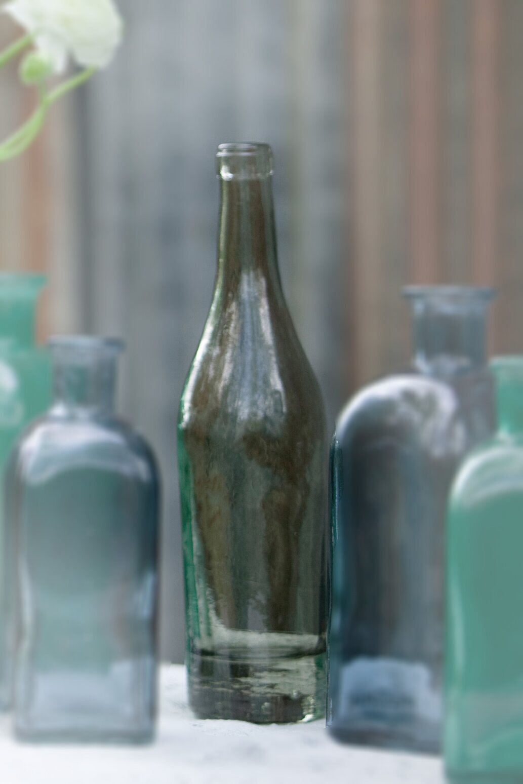 Bilden visar en distinkt flaskvas från varumärket Dixie, tillgänglig på Köpstaden.se. Detta är en 0,5-liters vas i en vacker rökgrå ton. Den står centralt placerad, omgiven av andra flaskor i varierande nyanser av grönt och blått, vilket skapar en harmonisk och naturlig komposition. Vasen har en slank och hög form, som elegant sträcker sig uppåt, och dess yta är blank med en lätt reflektion som fångar ljuset på ett subtilt sätt.