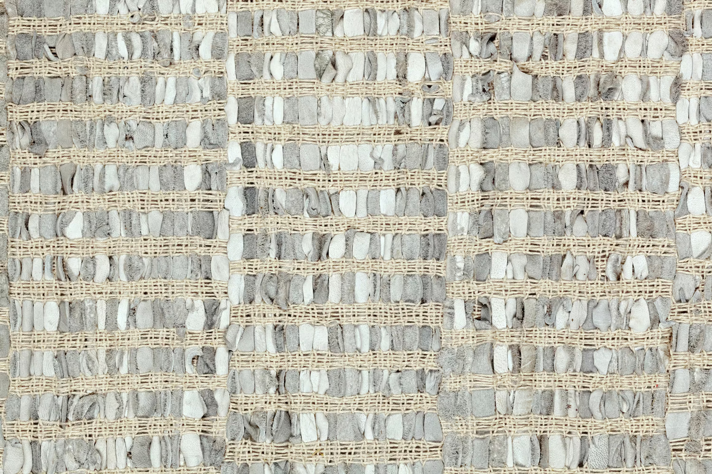 Vändbar trasmatta av återvunnet läder. 70% läder, 30% bomull.