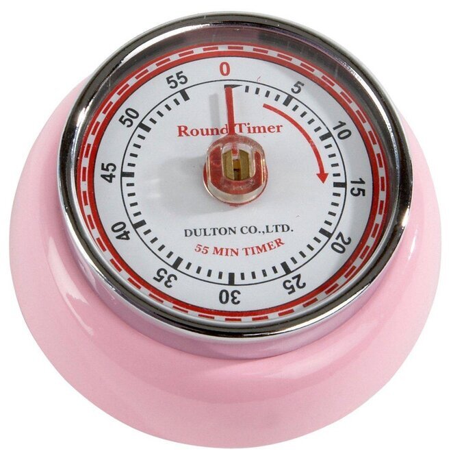 Bilden visar en kökstimer från Dulton, tillgänglig på Köpstaden.se. Timern är designad i en mjuk rosa färg som framhäver dess enkla men funktionella form. Basen är rund och slät, vilket gör att den kan placeras stabilt på diverse ytor i köket. Det är en praktisk accessoar för att hålla koll på matlagningstider.