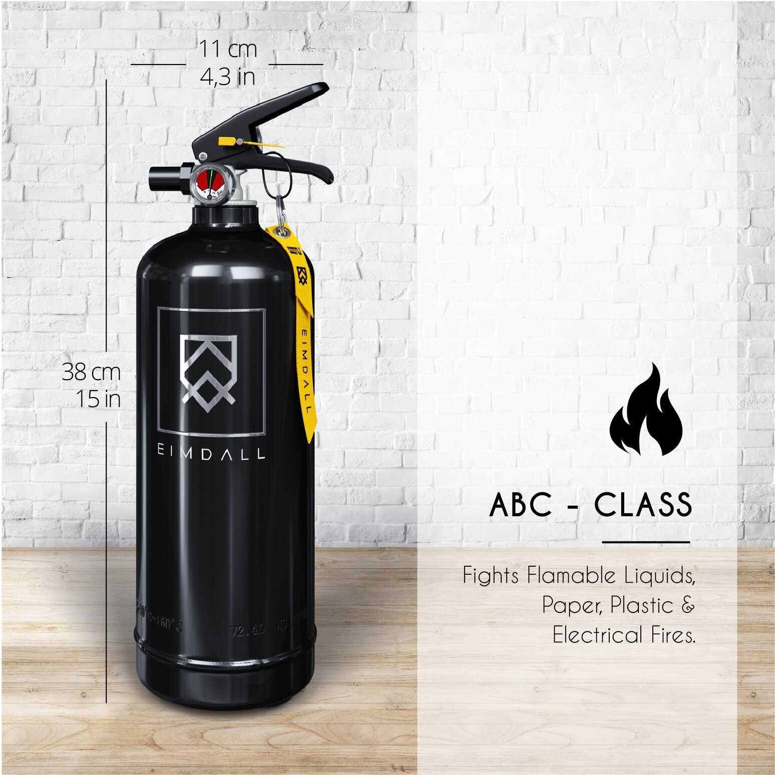 På brandsläckarens framsida finns Eimdalls logotyp, stiliserad och modern, strategiskt placerad mitt på den släta ytan. Under logotypen står namnet Eimdall tryckt i en ren och tydlig stil, vilket ger ett professionellt intryck. Denna design ger produkten en känsla av noggrann tillverkning och genomtänkt estetik.